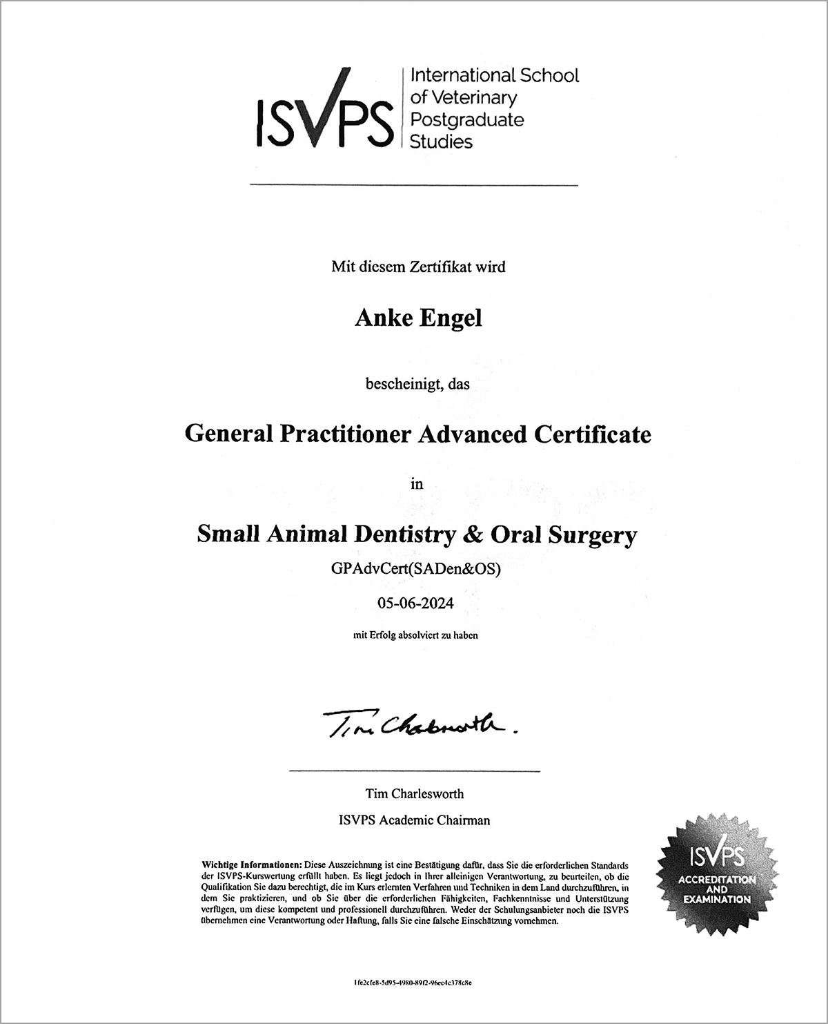 Von Juli 2023 bis Juni 2024 absolvierte Anke Engel das posgraduierten Studium in fortgeschrittener Tierzahnheilunde "General Practitioner Advanced Certificate in Dentistry and Oral Surgery" bei Improve International mit erfolgreich abgeschlossener Prüfung bei der ISVPS (International School of Veterinary Postgraduate Studies) und erreichte des Zertifikat.